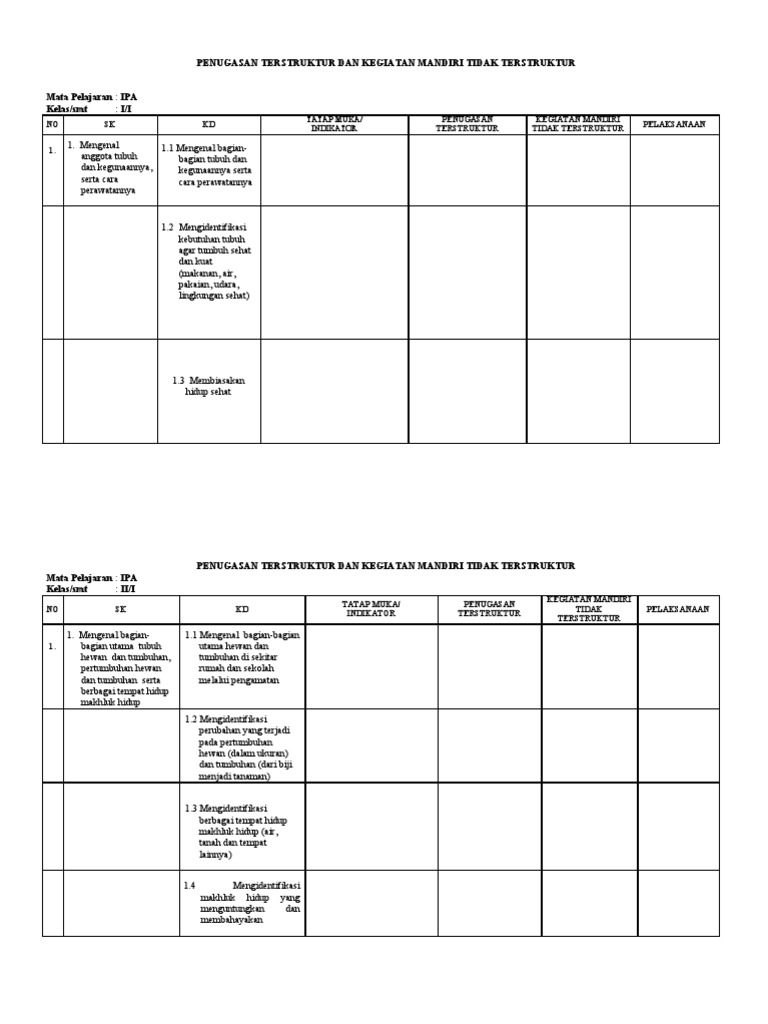 Tugas mandiri terstruktur dan tugas mandiri tidak terstruktur merupakan bentuk penugasan yang sering dilakukan oleh guru dalam proses pembelajaran. 1 standar isi 1 guru mengembangkan perangkat pembelajaran pada. Tugas mandiri terstruktur dan tidak terstruktur merupakan bentuk penugasan yang diberikan guru berupa pendalaman materi pada kompetensi dasar tertentu sebagai rangkaian dari kegiatan pembelajaran selain tatap muka. 2012/2013 standar kompetensi dasar kegiatan waktu keterangan kompetensi 2. Download format tugas mandiri terstruktur dan tidak terstruktur. 3 3 data pendukung sd mi 14 04 03. Contoh tugas terstruktur dan tidak terstruktur sd smp sma ini akan menjadi topik bahasan saya pada postingan kali ini. Format ini sebagai salah satu format penilaian bagi guru dalam melihat tugas yang diberikan kepada siswa baik yang terstruktur ataupun tidak terstruktur. Bisa sampai satu bulan atau akhir semester. Sudah kita ketahui bersama bahwa menurut uu nomor 20 tahun 2003 yang dinamakan kurikulum merupakan seperangkat rencana dan sebuah pengaturan. Tugas mandiri terstruktur dan tidak terstruktur merupakan bentuk penugasan yang diberikan guru berupa pendalaman materi pada kompetensi dasar tertentu sebagai rangkaian dari kegiatan pembelajaran selain tatap muka. Aspek yang dinilai/skor capaian n o Bapak dan ibu semuanya yang masih juga belum pernah membuat tugas yang diberikan pada siswa yang bersifat mandiri atau bukan mandiri dan sering kita sebut tugas mandiri terstruktur dan tugas mandiri tidak terstruktur di sini kami telah membagikan format dan bentuk yang sudah jadi dalam format office words, barangkali yang membutuhkan silahkan dipilih pada menu berikut ini:
